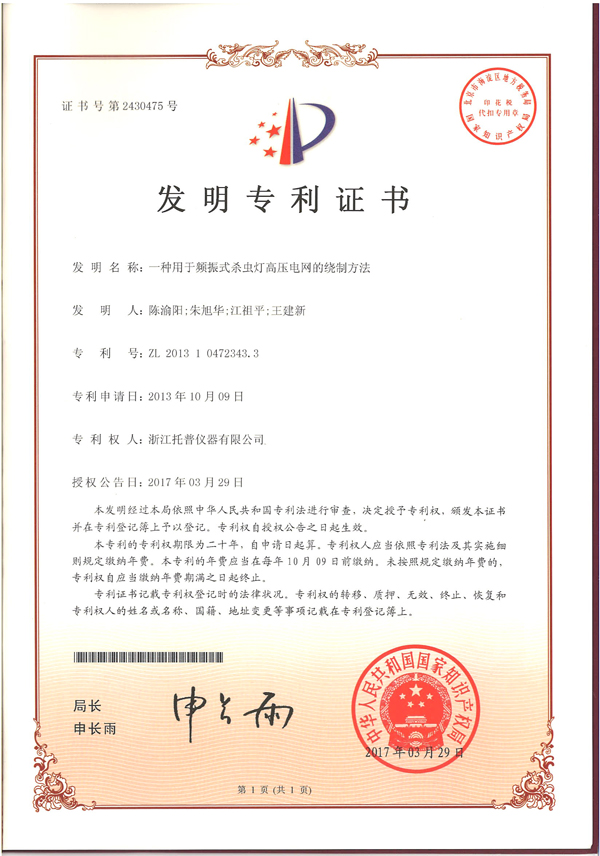 近日,我司托普云農又喜獲一項發明專利。據悉,該發明專利名稱為“一種用于頻振式殺蟲燈高壓電網的繞制方法”,發明專號為ZL201310472343.3。