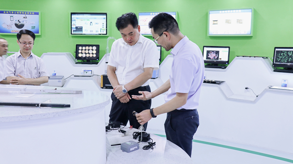 在托普云農展廳內,唐冬壽副廳長一行聽取了陳渝陽董事長關于公司使命愿景、發展歷程、實踐案例等相關內容的匯報。