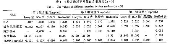 蛋白濃度測定方法有很多種,各種蛋白質含量測定的研究也屢見報道。每種方法都有其優點和局限性,在蛋白質樣品中往往會含有一些化學試劑,有些化學試劑會干擾蛋白濃度測定。因此,尋找合適的實驗方法以避免干擾對蛋白濃度測定的準確性至關重要。基于Lowry法在測定PEG_IL_6樣品時出現大量黃綠色沉淀,尿素對BCA法測定蛋白濃度測定有嚴重干擾,影響結果準確性,我們試驗了外兩種方法,并進一步對方法進行了比較分析。