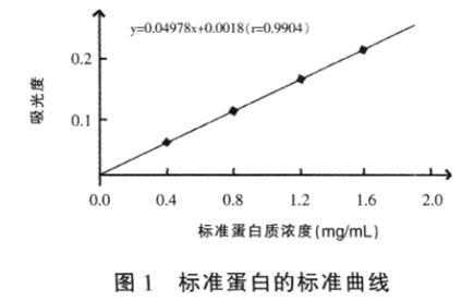 3.1 標準曲線繪制將蛋白質(zhì)標準液( 7 g/dL) 用0.1 mol/L NaOH 溶液稀釋至4 mg/mL。分別取蛋白質(zhì)標準液( 4 mg/mL) 0.0、0.1、0.2、0.3、0.4、0.5mL于25 mL 具塞比色試管中, 用蒸餾水補齊至1.0mL, 然后各比色管中加入4.0 mL 雙縮脲試劑, 混勻, ( 37±0.2) ℃保溫30 min。以空白管調(diào)零, 用751 型分光光度計在540 nm 波長, 杯徑1 cm, 測定吸光值。以蛋白質(zhì)含量(mg/mL) 為橫坐標, 以吸光值為縱坐標作標準曲線, 如圖1 所示。
