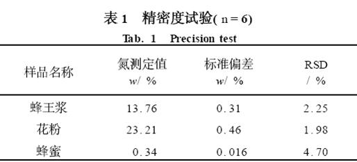 取蜂王漿、花粉、蜂蜜樣品,按試驗方法進行6次測定,樣品測定值的相對標準偏差(RSD) 結果見表1 。