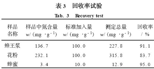 取蜂王漿、花粉、蜂密樣品,加入氨氮標準溶液,按試驗方法進行樣品處理與測定,回收率測定結果見表3 。