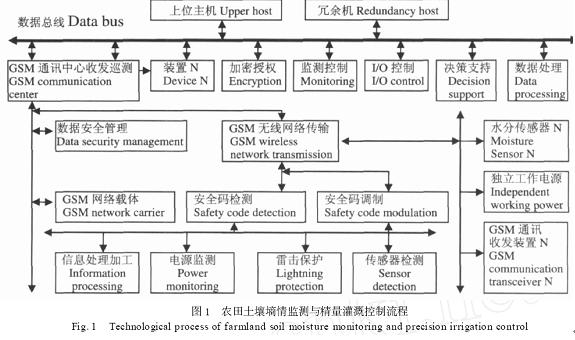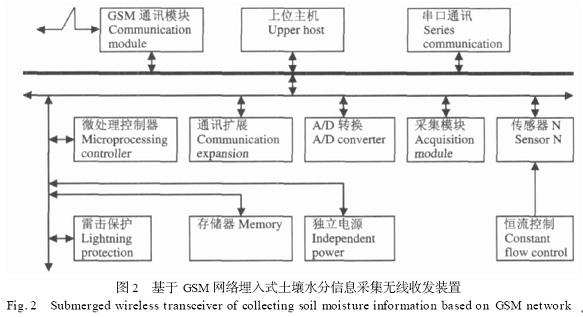 根據(jù)區(qū)域農(nóng)田土壤不同的土質(zhì)和作物,采取合理分布埋入土壤中進(jìn)行水分信息監(jiān)測點采樣,由收發(fā)過程控制級和中心計算機(jī)控制決策級組成的一個以GSM 網(wǎng)絡(luò)為紐帶的集中監(jiān)控而灌溉現(xiàn)場監(jiān)測相對分散、配置靈活、組態(tài)方便、現(xiàn)場設(shè)備裝置隱蔽性強(qiáng)的具有高可靠性的實用系統(tǒng)。