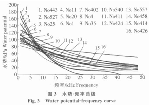 利用在山東禹城試驗站和河南封丘試驗站進(jìn)行的土壤水分傳感器適應(yīng)性分析得出以下分析數(shù)據(jù):假設(shè)傳感器測量頻率的量程為0~50 kHz。在該量程范圍內(nèi),依據(jù)土壤水分傳感器的標(biāo)定曲線,繪制各個傳感器的水勢2頻率曲線,按率定公式計算的水勢隨頻率的增加而增大(圖3) 。