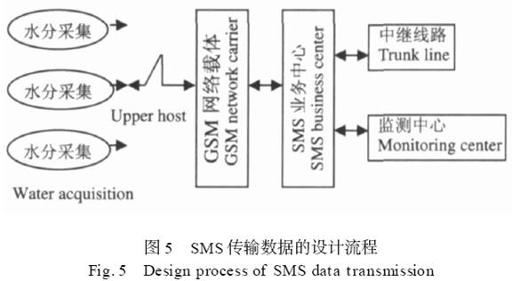 利用GSM 進(jìn)行的土壤墑情監(jiān)測SMS 傳輸數(shù)據(jù)的設(shè)計方法(圖5) ,系統(tǒng)設(shè)置以無線網(wǎng)絡(luò)為載體的通訊驅(qū)動控制DDC(Digital Data Converter) ,將分布在灌溉監(jiān)測現(xiàn)場的各種相關(guān)硬件設(shè)備驅(qū)動控制器通過無線網(wǎng)絡(luò)進(jìn)行數(shù)據(jù)交換實現(xiàn)無線驅(qū)動,完全實現(xiàn)了對區(qū)域農(nóng)田墑情監(jiān)測的無線操作雙向信息傳輸和灌溉驅(qū)動。