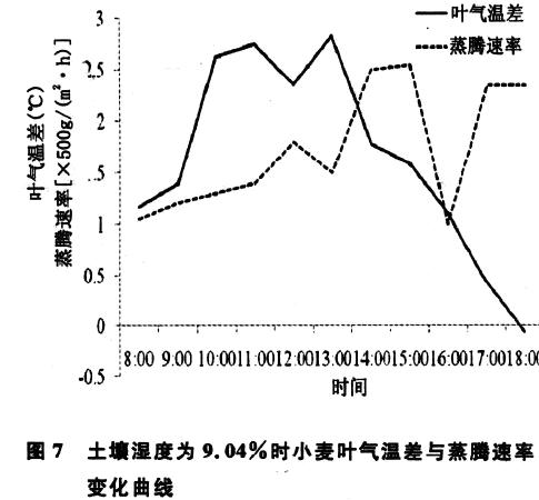 由圖7 - 11 可以看出,土壤濕度< 15 %時,在上午的11 :00 之前,蒸騰速率隨著小麥葉氣溫差的增加而加大,12 :00 之后,蒸騰速率并不隨著小麥葉氣溫差的增大而增強,未表現出規律性。當土壤濕度超過15 %以后,水分的充分供應既保證了較高的蒸騰速率,也有效降低了葉片溫度,減小了小麥葉氣溫差,從上午開始,小麥葉氣溫差和蒸騰速率的變化趨勢就相反。