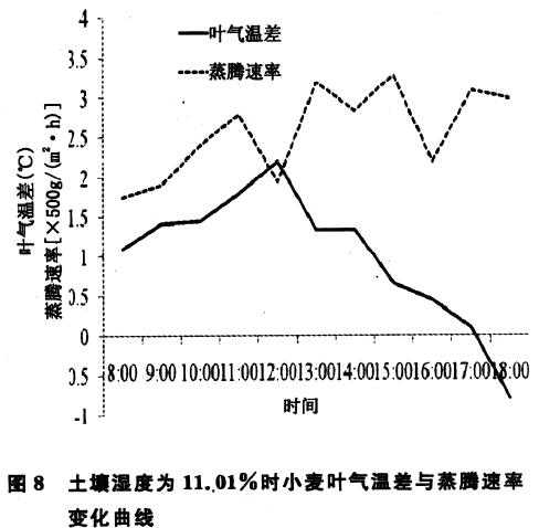 根據能量平衡原理,葉片與空氣溫差的變化取決于太陽凈輻射的強弱和作物蒸騰量的大小。當作物獲得充分的水分供應,葉片因蒸騰而冷卻,溫度下降并低于其在蒸騰抑制時所能達到的溫度;而當水分供應減少時,作物蒸騰的潛熱減少,顯熱增加,葉片溫度相應上升。