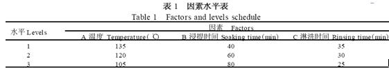 1. 4 正交設計提取方法 根據熱浸提—油重法測定原理,選定浸提溫度(A) 、浸提時間(B) 和淋洗時間(C) 作為考察因素,各設3 個水平,選用L9 (34 ) 正交表進行試驗(見表1) ,三次重復。