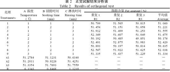 1. 6 數據分析 粗脂肪含量( %) = (W2 - W1 ) ×100/ W0 ,正交試驗結果的統計分析參考明道緒主編的有重復觀測值正交試驗結果,用新復極差法進行多重比較,在DPS 7. 05上完成。