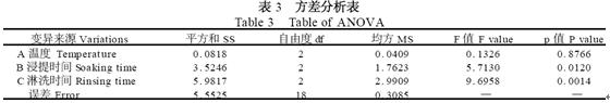 對粗脂肪含量數據進行直觀分析(表2) ,比較3個因素的極差( R) ,可見RC(1 . 1219) > RB