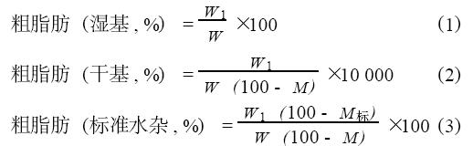 粗脂肪濕基含量、干基含量和標(biāo)準(zhǔn)水雜含量分別按公式(1) 、(2) 和(3) 計(jì)算: