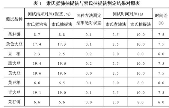 中華人民共和國(guó)國(guó)家標(biāo)準(zhǔn)中規(guī)定: 糧食、油料中的粗脂肪含量測(cè)定采用索氏抽提法。此方法經(jīng)過長(zhǎng)期操作實(shí)踐, 存在一定的弊端, 主要是操作時(shí)間長(zhǎng)、試驗(yàn)人員勞動(dòng)強(qiáng)度大、水和電等能源消耗多。索氏抽提法測(cè)定一個(gè)樣品僅抽提時(shí)間就需要8h 以上, 整個(gè)試驗(yàn)自始至終需要12h左右, 工作效率極低。為解決這些問題, 我們進(jìn)行了長(zhǎng)時(shí)間的探索和多次測(cè)試, 測(cè)定結(jié)果證明, 用索氏煮沸抽提法測(cè)定糧食、油料中的粗脂肪含量, 結(jié)果非常理想, 與標(biāo)準(zhǔn)方法———索氏抽提法的測(cè)定結(jié)果十分接近, 此方法值得推廣。