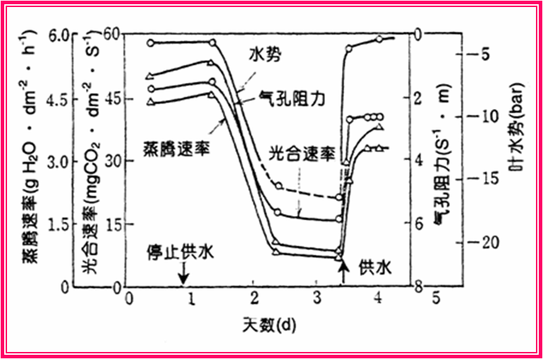 當土壤水分不足,蒸發作用過于旺盛:無法將作物所需的元素正常的運輸到植物需要的地方,比如幼果以及幼苗,是植物不能正常的生長。同時水分不足還影響著植物的有機物質即光合作用的正常進行。水分虧缺會使光合速率下降。在水分輕度虧缺時,供水后尚能使光合能力恢復,倘若水分虧缺嚴重,供水后葉片水勢雖可恢復至原來水平,但光合速率卻難以恢復至原有程度,下圖就是土壤水分缺損以及修復水分過程中,植物光合作用以及其他的一些生理反應的過程: