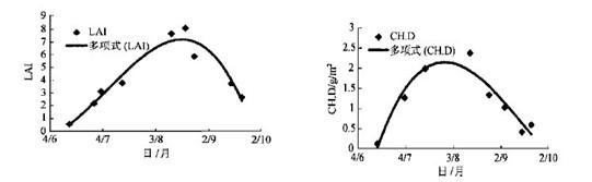 在水稻的光合作用過程中影響水稻有機物質合成的主要因素有葉面積(LAI)、葉綠素含量(CH.D)、陽光、二氧化碳的濃度等,在光合反應過程中葉面積過大也不一定會利于植物的有機物質的合成,而水稻的葉面積以及葉綠素含量增加有一定的規律的,通過使用便攜式葉面積測定儀對水稻的葉面積來進行測量,接著通過使用葉綠素計來對葉綠素含量進行測量,得出如下圖顯示: