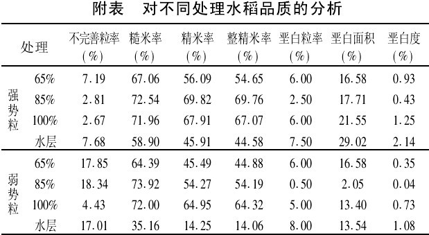 從上表可以看出85%處理的水稻品質明顯高于其他處理,強勢粒在加工品質如糙米率、精米率和整精米率等方面明顯高于其他處理,在外觀品質方面(堊白度)也同樣優于其它處理。而弱勢粒除不完善粒率外,也同樣優于其他處理。在水稻的齊穗期以及生育期使用溫濕度監測儀來進行控制土壤的含水量是比較的合理的,這樣既不浪費水資源同時又能增加水稻的產量以及品質。