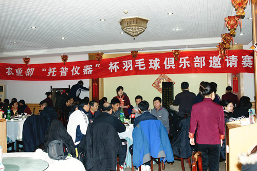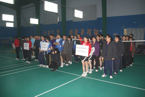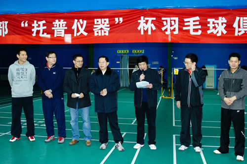由全國農(nóng)技推廣中心羽毛球俱樂部主辦、浙江托普儀器有限公司全程贊助承辦的農(nóng)業(yè)部"托普儀器"杯羽毛球俱樂部邀請賽,于2011年1月3日上午在 北京陽光羽毛球館隆重舉行。當(dāng)天上午9點,邀請賽舉行了熱烈簡短的開幕儀式,開幕式由農(nóng)技推廣中心夏敬源主任主持,托普儀器公司總經(jīng)理陳渝陽先生和參賽俱樂部代表農(nóng)業(yè)部農(nóng)墾局李偉國局長分別做了熱情洋溢的致辭,農(nóng)業(yè)部黨組副書記、常務(wù)副部長、農(nóng)業(yè)部機(jī)關(guān)羽毛球俱樂部名譽會長危朝安出席開幕式并為本次比賽開球,當(dāng)危部長擊球,球在空中劃出一道漂亮的弧線,本次比賽正式開始。