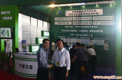 今年8月初,在蘭州召開的2011年全國旱作節水農業技術培訓班上,崔站長已經對托普儀器印象深刻,在榆中縣的甘肅省土壤墑情與旱情監測示范區進行實地參觀、考察時,更是現場對托普儀器的無線多點土壤墑情監測系統進行的了操作,并對此儀器的性能予以充分的肯定。此次土肥雙交會上,也專程到托普展區參觀、指導。托普儀器總經理陳渝陽先生陪同參觀,并介紹了托普儀器的發展概況及其他土肥類檢測儀器。