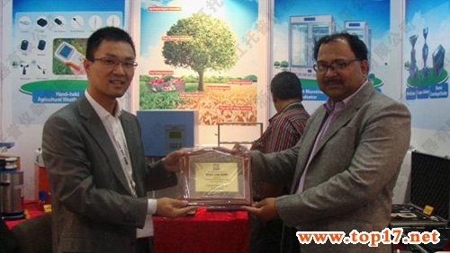 圖為:印度領導為托普儀器陳渝陽總經理頒發獎項