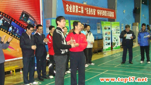 全國農(nóng)技中心陳生斗主任為本次活動(dòng)開幕式致辭中表示:這次很高興能參加本次“托普儀器”杯羽毛球邀請(qǐng)賽,首先感謝浙江托普儀器有限公司為本次活動(dòng)的全力贊助。就如本次活動(dòng)主題以“開展文體活動(dòng),推進(jìn)文化建設(shè)”一樣,不僅豐富大家的業(yè)余生活,通過體育活動(dòng)倡導(dǎo)強(qiáng)身健體、積極向上的氛圍,還增進(jìn)了農(nóng)業(yè)部系統(tǒng)內(nèi)各羽毛球俱樂部之間的溝通和交流。賽后,農(nóng)業(yè)部機(jī)關(guān)黨委張廣卿處長、農(nóng)業(yè)部市場司張合成司長和浙江托普儀器有限公司陳渝陽總經(jīng)理頒發(fā)優(yōu)勝獎(jiǎng)獎(jiǎng)杯,全國農(nóng)技中心陳生斗主任頒發(fā)季軍獎(jiǎng)杯,部直屬機(jī)關(guān)黨委唐珂常務(wù)副書記頒發(fā)亞軍獎(jiǎng)杯,部黨組成員、人事勞動(dòng)司梁田庚司長頒發(fā)冠軍獎(jiǎng)杯。