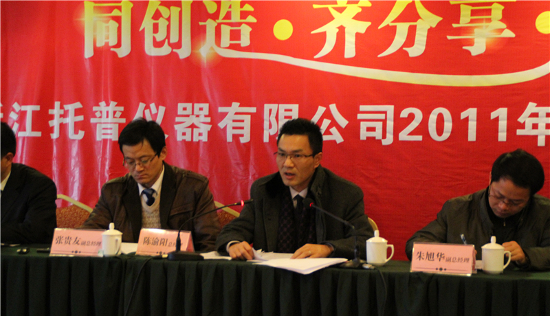 浙江托普儀器有限公司2011年年度總結表彰大會于2012年1月15日在銘泰大酒店七樓會議室圓滿召開。此次會議的主題是“同創(chuàng)造 齊分享 共飛揚”,托普上下110余人齊聚一堂,共同回顧2011年托普儀器的點點滴滴,并對2012年各項工作進行展望。