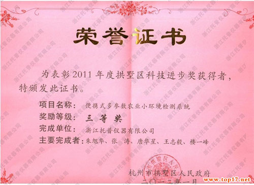 托普儀器研發(fā)的便攜式多參數(shù)農(nóng)業(yè)小環(huán)境監(jiān)測系統(tǒng)獲得全面成功,同時該項目也喜獲2011年度浙江省杭州市拱墅區(qū)科技進步三等獎。