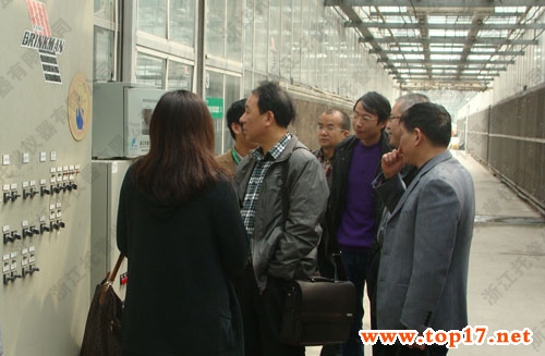 圖為:托普工作人員詳細講解托普物聯(lián)網(wǎng)系統(tǒng)的控制原理,左一為傳化陳堅總經(jīng)理,左二為戴守勤處長,右一為傳化榮松主任