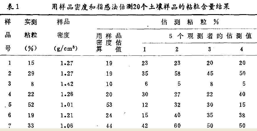 由于樣品密度與粘粒含量之間存在著密切的關(guān)系,因而意識(shí)到可以用樣品密度估測(cè)土坡質(zhì)地。為研究其實(shí)用價(jià)值,取質(zhì)地范圍很廣的20個(gè)上壤樣品進(jìn)行以下試驗(yàn):先測(cè)定樣品的粘粒含量和樣品密度,然后用上述的回歸方程,根據(jù)樣品密度估算粘粒含量。從粘粒含量的實(shí)測(cè)值與估測(cè)值間的R值和斜率值看,用樣品密度估算粘粒含量,明顯地比用指感法測(cè)的可靠。指感法估測(cè)的斜率值低,反映了一個(gè)總的趨勢(shì),即指感法估測(cè)的粘粒含量大約高出用土壤密度估測(cè)值的25寫(xiě)。