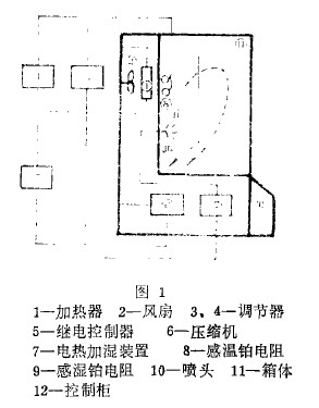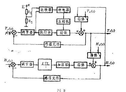 圖1是這種培養箱的結構原理示意圖。它由加熱、制冷、加濕及相應的控制系統等幾部分組成。其工作原理是,當溫度偏離給定值,如溫度升高,感溫電橋輸出信號,經放大控制制冷系統致冷,迫使溫度下降;倘若溫度低于給定值時,溫度控制系統工作,加熱器加熱,溫度升高,使溫度達到平衡。如果箱內需要加濕,感濕電橋輸出信號,濕度控制系統工作,電熱加濕器蒸汽噴濕;反之,需要減濕時制冷系統工作致冷,達到除濕的目的,從而保持濕度的恒定。