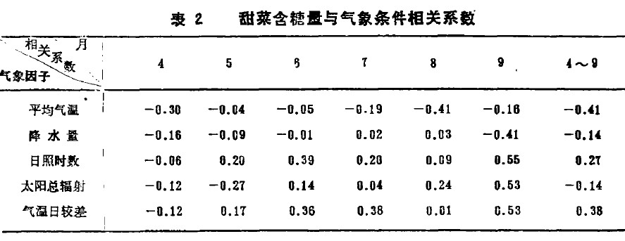 氣候含糖量與4~9月氣溫日較差呈正相關(見表2),相關系數(shù)r=38,5,月各月均為正相關,7月達。8~9月達53,具有與日照相關相同的趨勢,因此氣溫百較差也是影響甜菜搪分積累的主要氣象因子之。