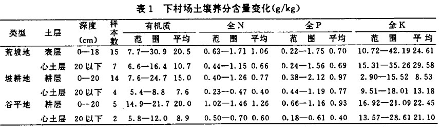 從表1可知,心土層(一般為20cm以下)土壤全量養分除全K外普遍低于表土層。占全場面積一半以上的坡耕地土壤除全磷略高于荒坡地和谷平地外,全氮、全鉀、有機質含量均低,特別是全K含量遠低于荒坡地和谷平地。從養分三要素含量來看,下村場土壤的氮素供應狀況差,磷素供應亦不足(全磷含量低于。.8一1.09/kg以下),而鉀素的潛在供應能力荒坡地和谷平地較強,坡耕地的供鉀潛力表現為低,這可能與其開墾利用、分解淋溶有關。