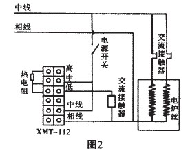 當(dāng)實(shí)際溫度低于設(shè)定溫度時(shí),儀表繼電器低總通,接觸器線圈通電,常開觸點(diǎn)吸合而加熱;實(shí)際溫度高于設(shè)定溫度時(shí),儀表繼電器低總斷而使加熱絲斷電。