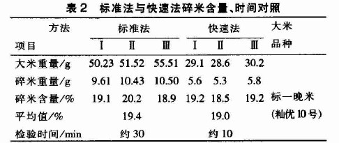 從檢驗過雜質的大米樣品中,用分樣器平均分取約25g大米,倒人合適也徑的篩層內,以每秒1轉的速度,回轉半徑約10 cm,在玻璃板上正反時針回轉各篩10圈,取出篩,將篩上大米小心倒在玻璃板一端,將篩下物倒人樣品盤內,重新套好篩層,再將篩下物倒人篩內,以同樣的方法再篩選2次。第二次正反時針回轉各篩8圈,第三次篩4圈。將篩上物和篩下物分開倒在玻璃板上。按規定揀出碎米中的整米、整米中的碎米,用感量0.1 g的天平稱取碎米重量,計算碎米含量,記錄每次檢驗時間。檢驗結果對照見表1、表2