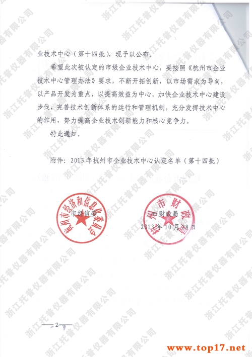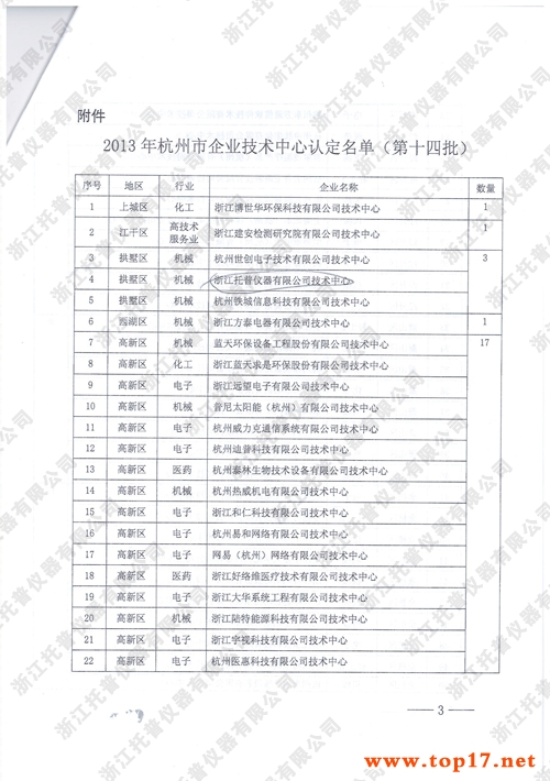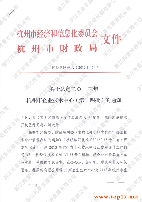 經(jīng)企業(yè)申報各有關(guān)單位推薦,并組織專家評審、社會公示、經(jīng)杭州市經(jīng)信委和財政局研究認定浙江托普儀器有限公司等65家企業(yè)技術(shù)中心為2013年杭州市企業(yè)技術(shù)中心(第十四批)。