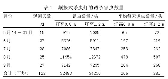 2.誘殺害蟲數(shù)量大示范區(qū)固定2盞殺蟲燈,1盞燈高0.8m,1盞燈高1.2m,從5月14日-9月30日歷時139d,其中下雨日14d,停電故障3d,實際記載天數(shù)122d。表2可見,單燈最高每天可誘殺害蟲507頭,平均273頭。