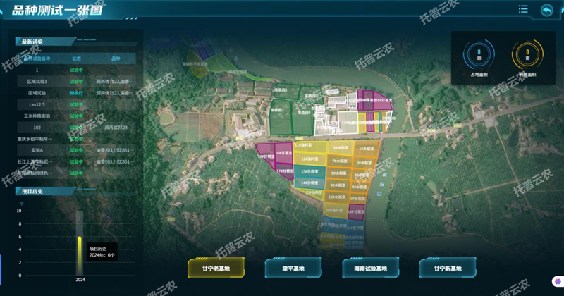 科研育種一張屏:GIS地圖展示基地的地塊劃分,團隊或課題小組的地塊分布;可視化展示團隊的育成品種總數,以及各個團隊育成品種總數及歷年的趨勢;可視化展示優勢品種的品種名,圖片及簡介信息,可視化展示課題組或團隊的簡介;可視化展示課題組或團隊的科研成果等成績。